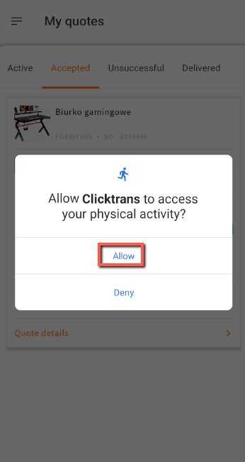 - Quando te pedirmos acesso à tua atividade física, escolhe 'Permitir'. Não te preocupes, não vamos verificar quantos passos dás diariamente. Isto simplesmente permite que a app móvel Clicktrans acompanhe os envios com mais precisão e poupe a bateria ao mesmo tempo.